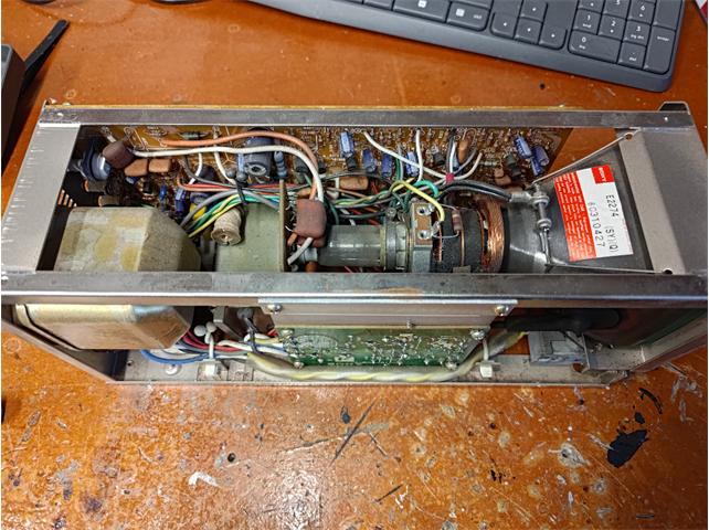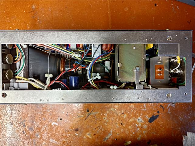 Once out you can see right into the monitor enclosure as there is no bottom panel. There is 4 screws to remove the top/side cover of the unit, two on each side. Once removed the cover pulls up and off. Now we get a full look into the complex internals of this tiny monitor.