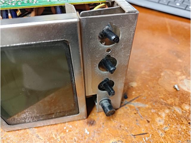 Moving to the front of the monitor where the knobs are located, there is two screws to remove, releasing the front panel consisting of the adjustment knobs and the power switch. The front panel can then be removed by pulling back and rotating the panel to get it out. WD-40 was then sprayed into the potentiometers to clean them up. I then cleaned the inside of the monitor, getting dust off the CRT and circuit boards.